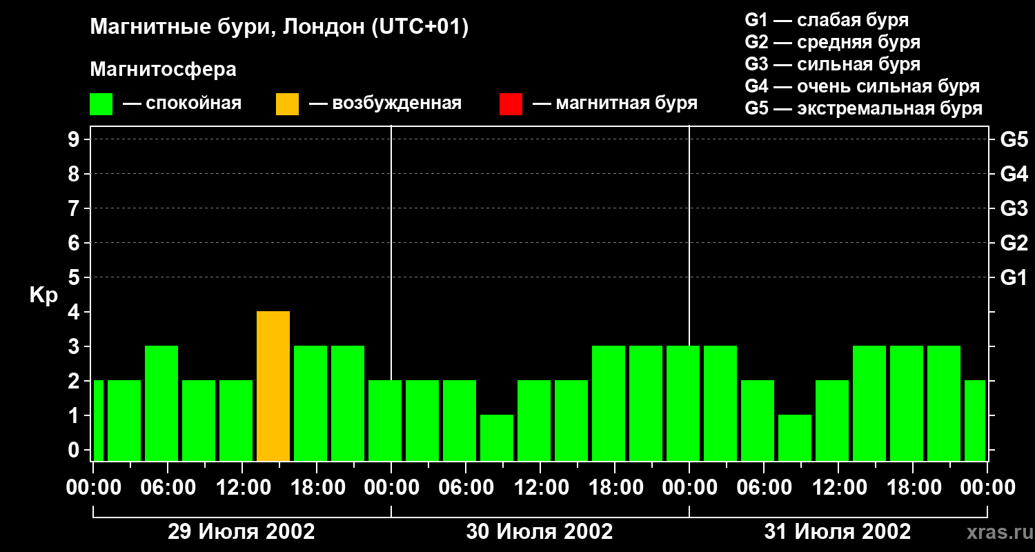 Изменения геомагнитного индекса Kp с 29 по 31 июля 2002 года для средних широт