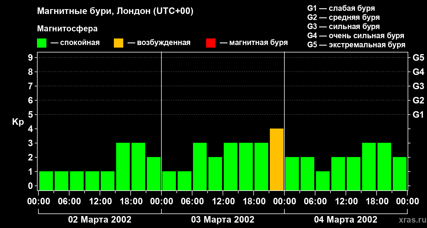 Изменения геомагнитного индекса Kp с 2 по 4 марта 2002 года для средних широт