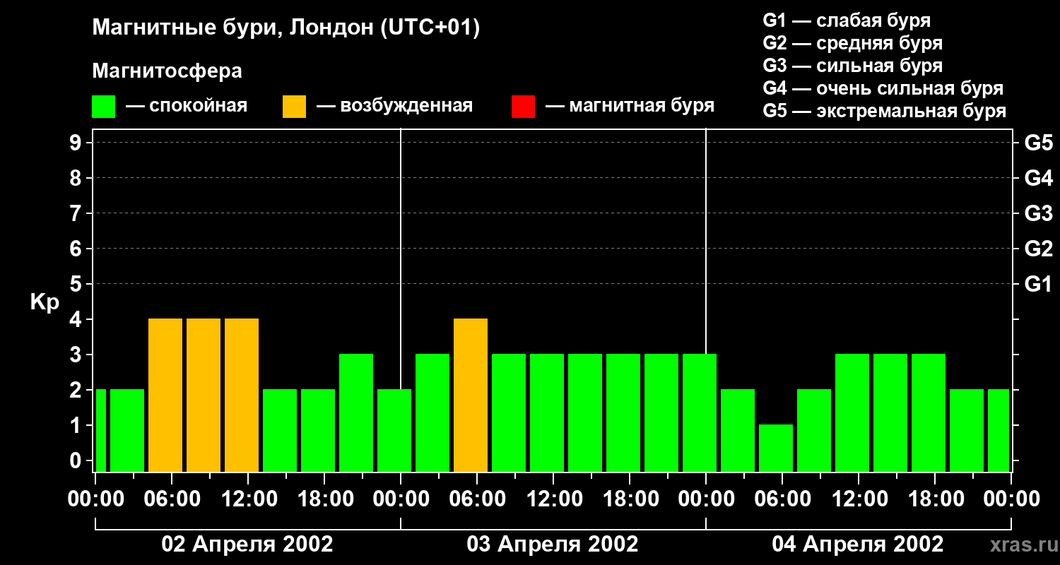 Изменения геомагнитного индекса Kp с 2 по 4 апреля 2002 года для средних широт