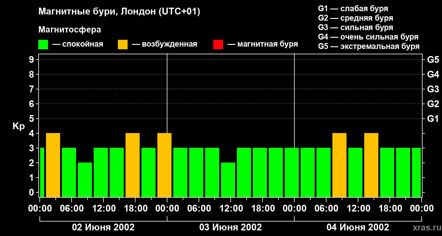 Изменения геомагнитного индекса Kp с 2 по 4 июня 2002 года для средних широт