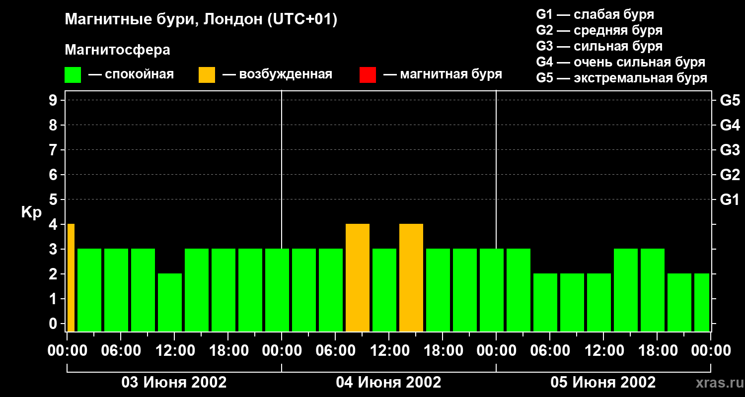 Изменения геомагнитного индекса Kp с 3 по 5 июня 2002 года для средних широт