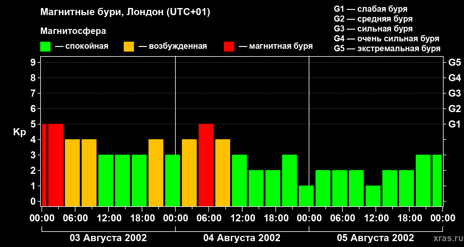 Изменения геомагнитного индекса Kp с 3 по 5 августа 2002 года для средних широт