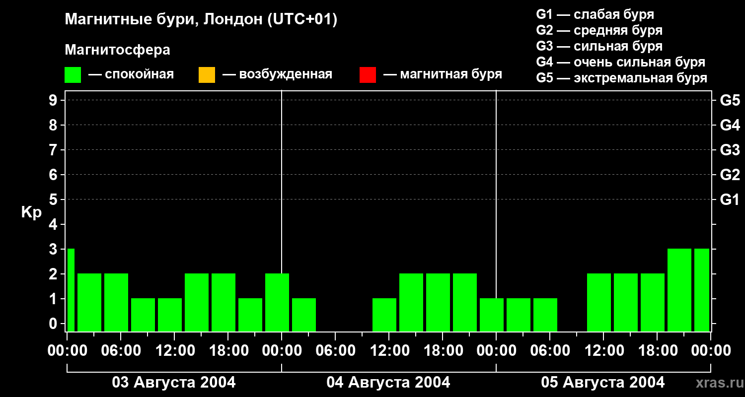 Изменения геомагнитного индекса Kp с 3 по 5 августа 2004 года для средних широт