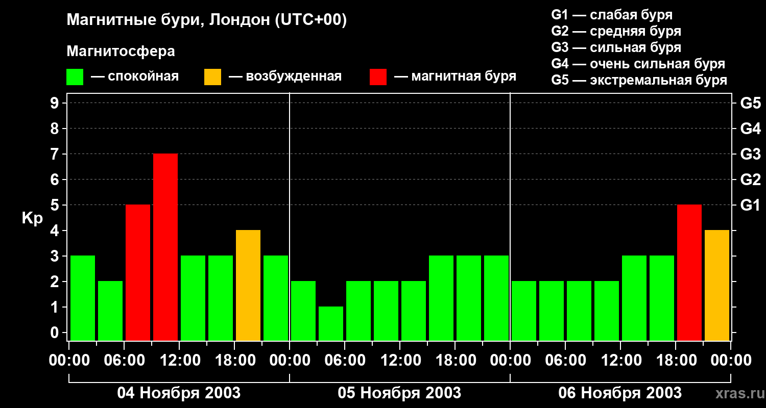 Изменения геомагнитного индекса Kp с 4 по 6 ноября 2003 года для средних широт