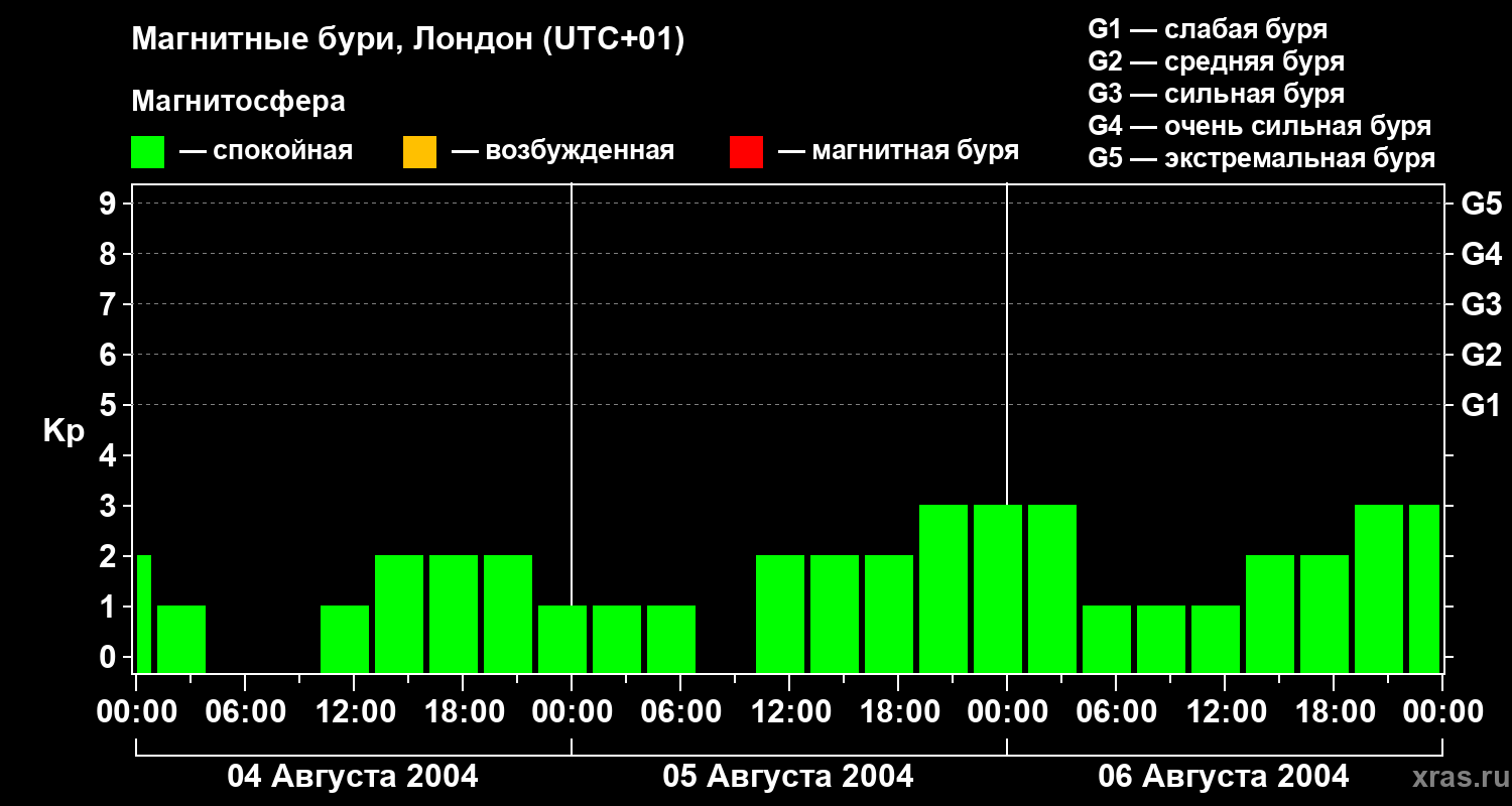 Изменения геомагнитного индекса Kp с 4 по 6 августа 2004 года для средних широт