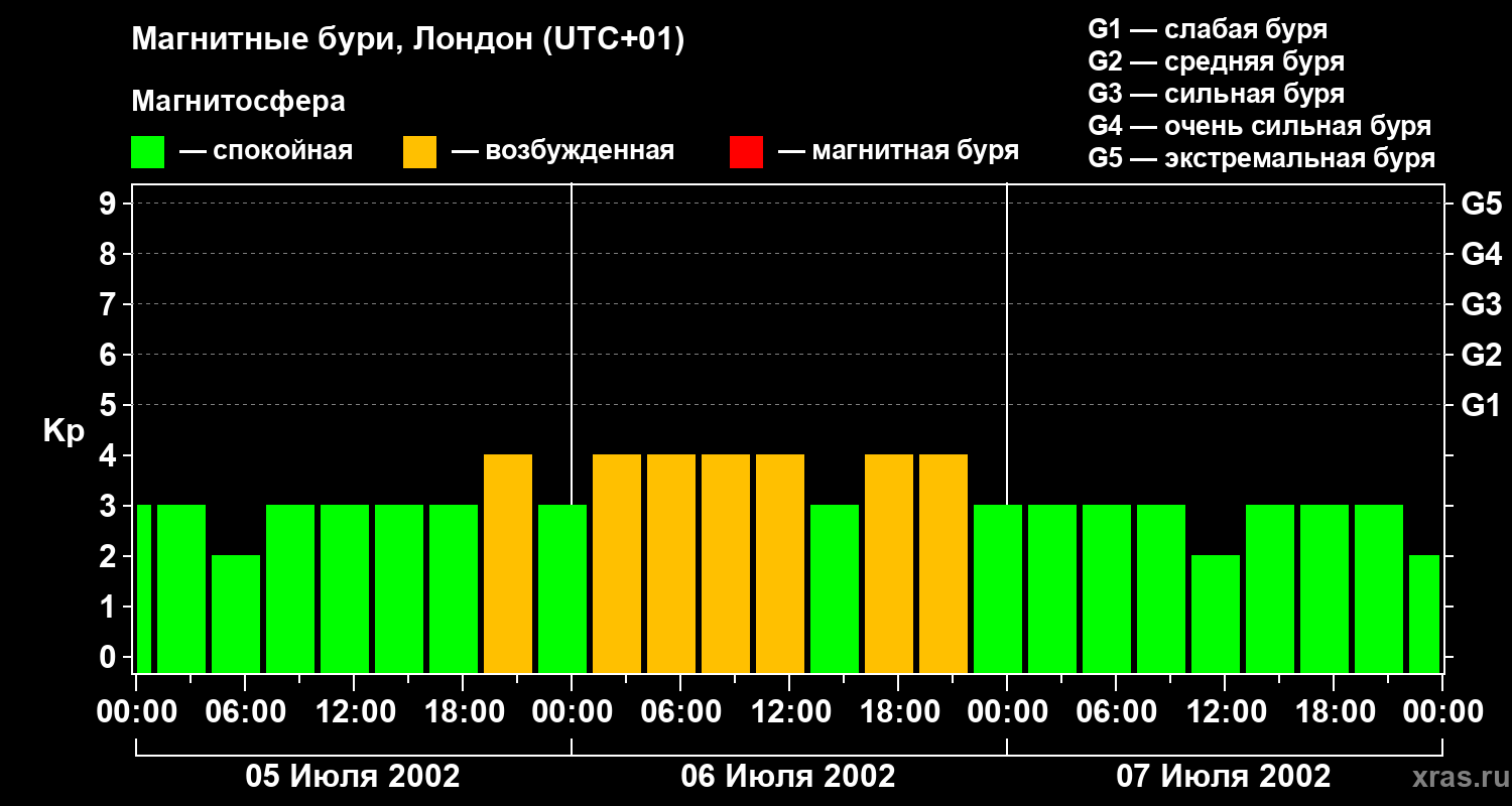 Изменения геомагнитного индекса Kp с 5 по 7 июля 2002 года для средних широт