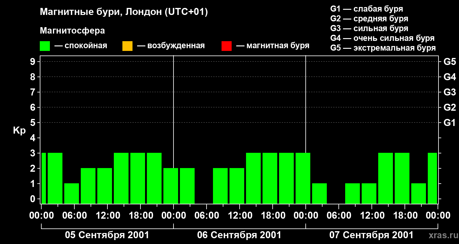 Изменения геомагнитного индекса Kp с 5 по 7 сентября 2001 года для средних широт