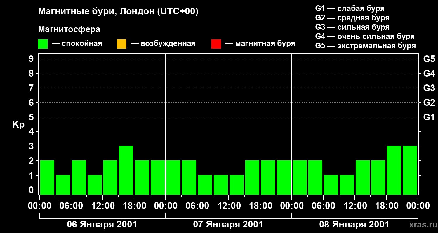 Изменения геомагнитного индекса Kp с 6 по 8 января 2001 года для средних широт