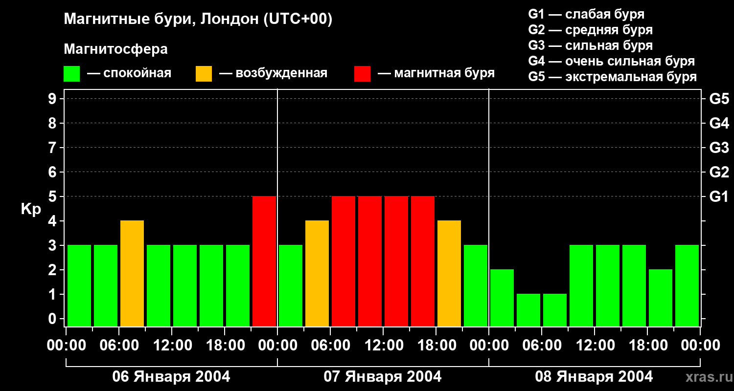 Изменения геомагнитного индекса Kp с 6 по 8 января 2004 года для средних широт