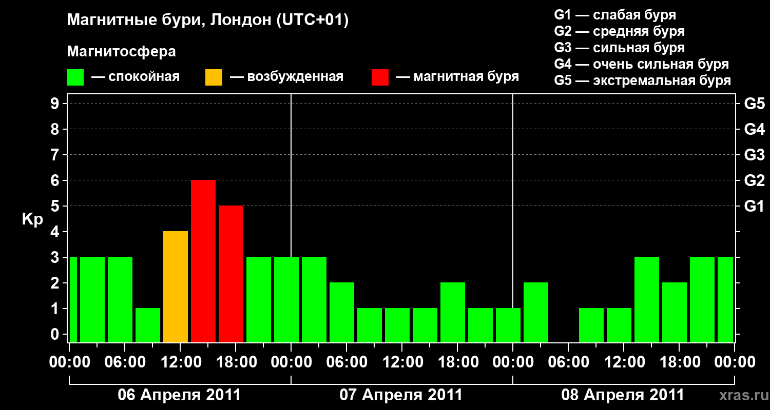 Изменения геомагнитного индекса Kp с 6 по 8 апреля 2011 года для средних широт