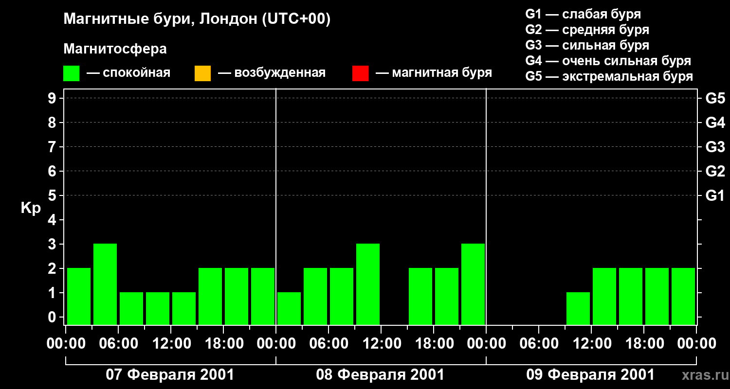 Изменения геомагнитного индекса Kp с 7 по 9 февраля 2001 года для средних широт