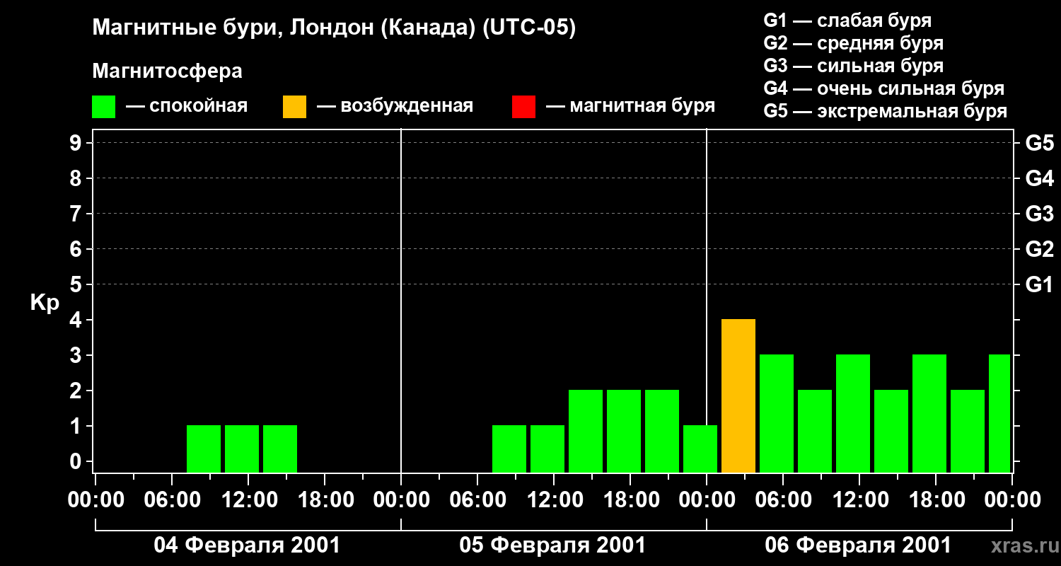 Изменения геомагнитного индекса Kp с 4 по 6 февраля 2001 года для средних широт