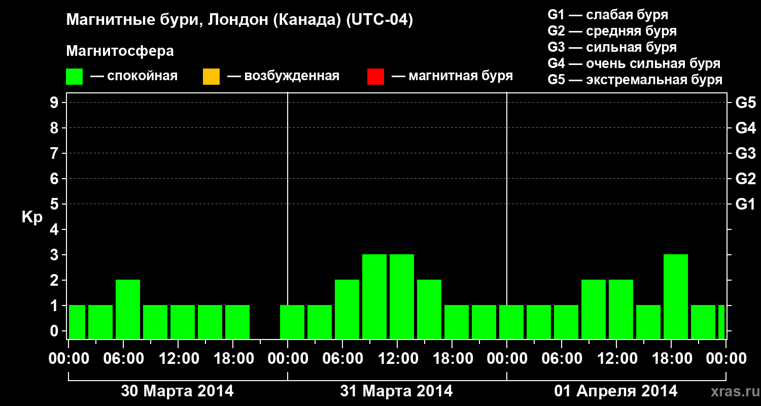 Изменения геомагнитного индекса Kp с 30 марта по 1 апреля 2014 года для средних широт