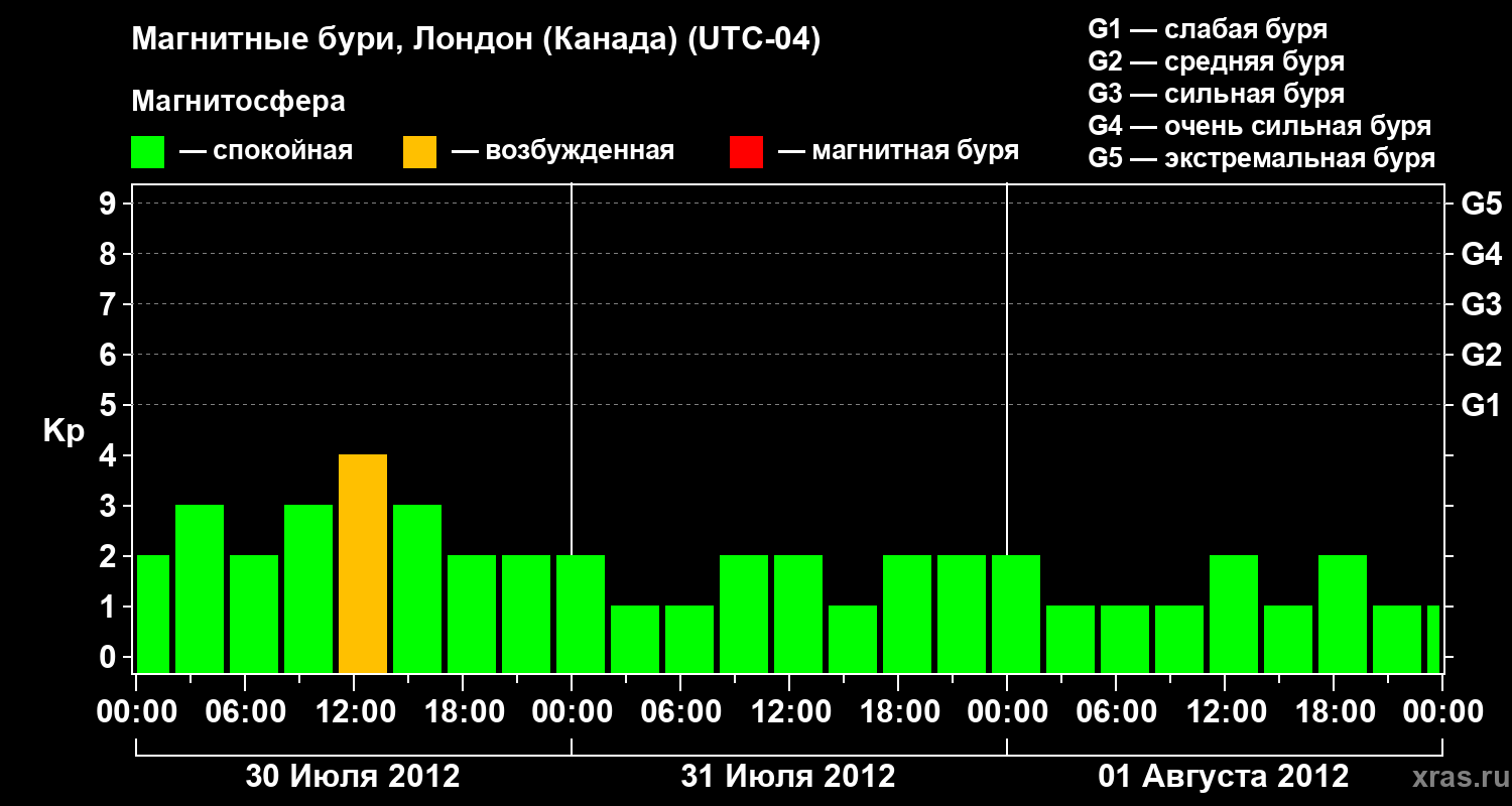 Изменения геомагнитного индекса Kp с 30 июля по 1 августа 2012 года для средних широт