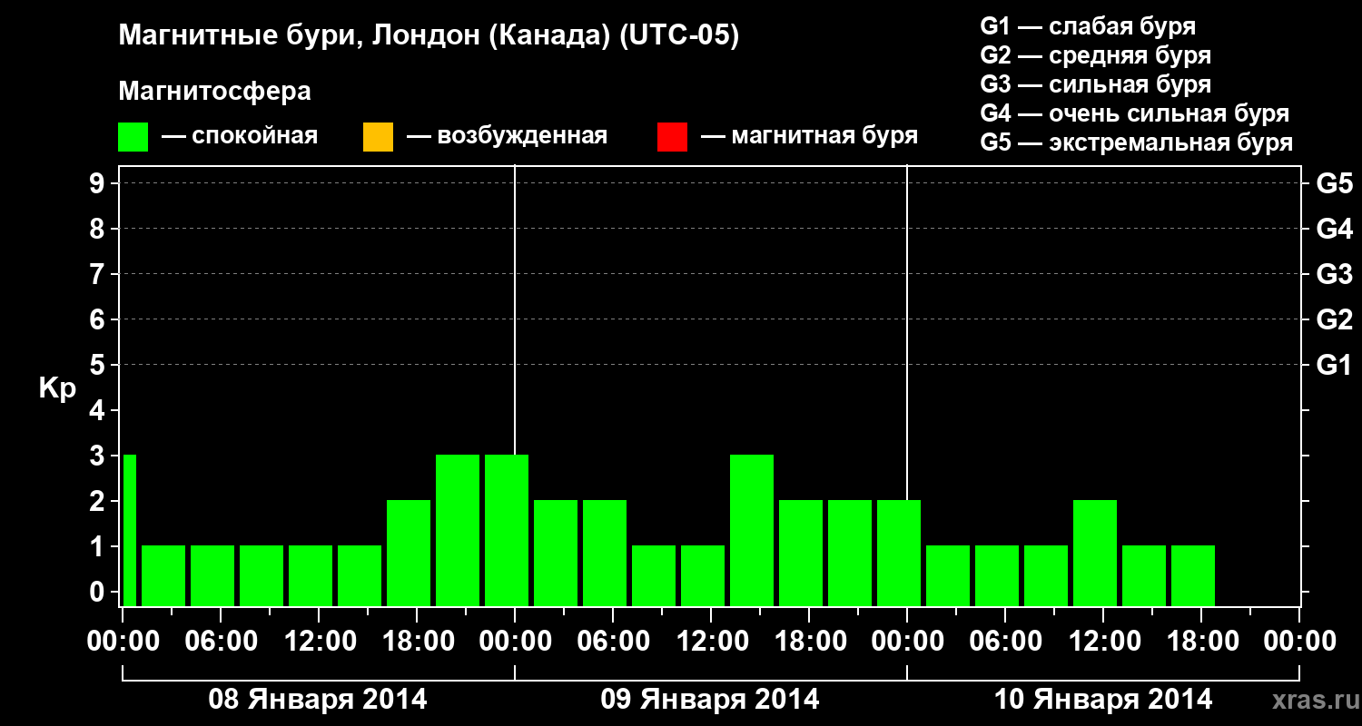 Изменения геомагнитного индекса Kp с 8 по 10 января 2014 года для средних широт