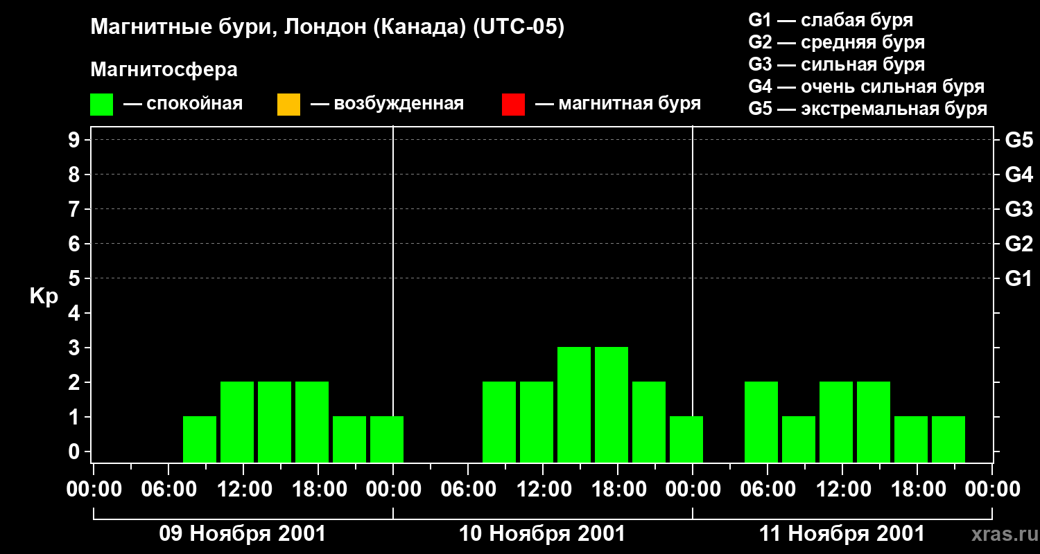 Изменения геомагнитного индекса Kp с 9 по 11 ноября 2001 года для средних широт