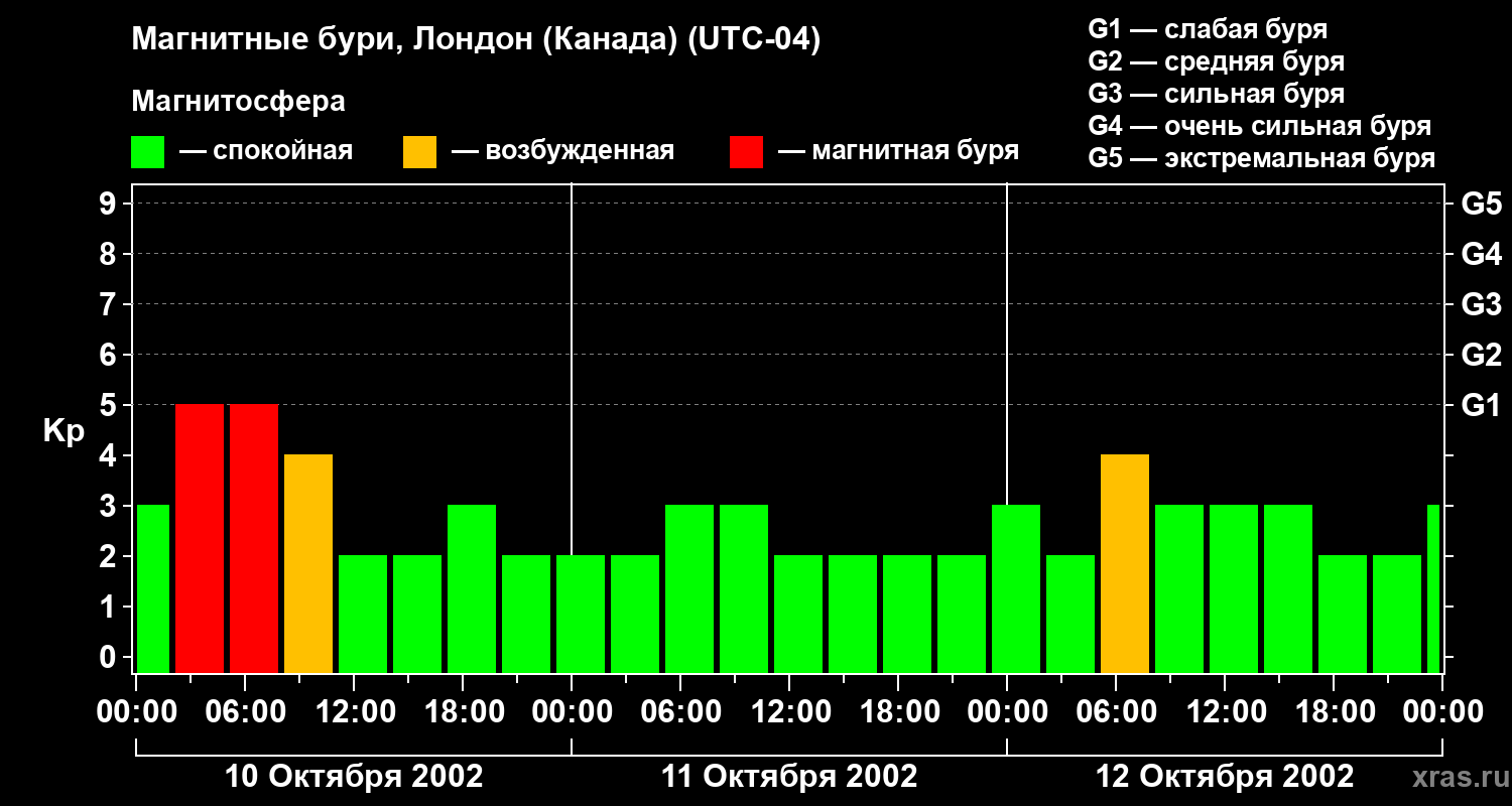 Изменения геомагнитного индекса Kp с 10 по 12 октября 2002 года для средних широт