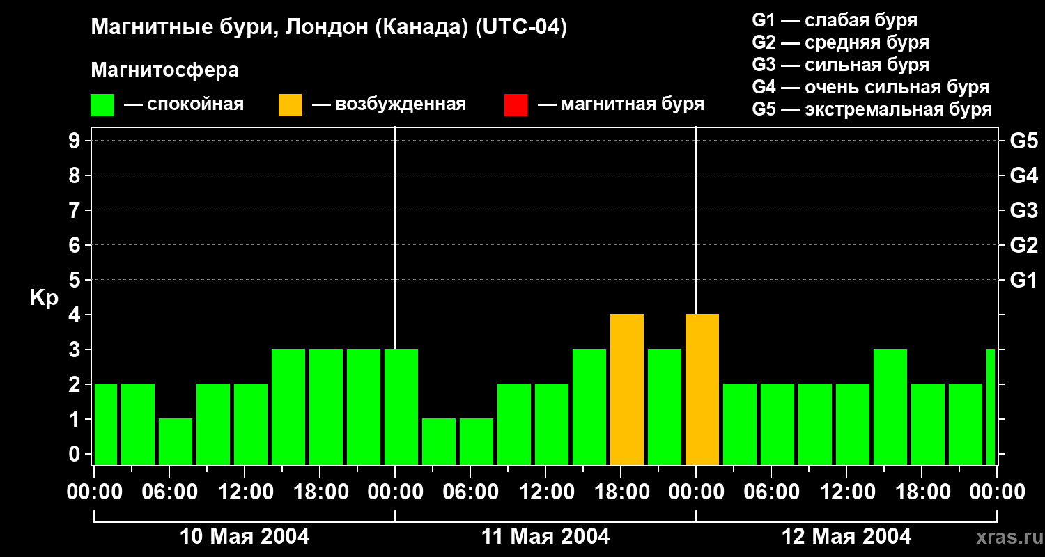 Изменения геомагнитного индекса Kp с 10 по 12 мая 2004 года для средних широт