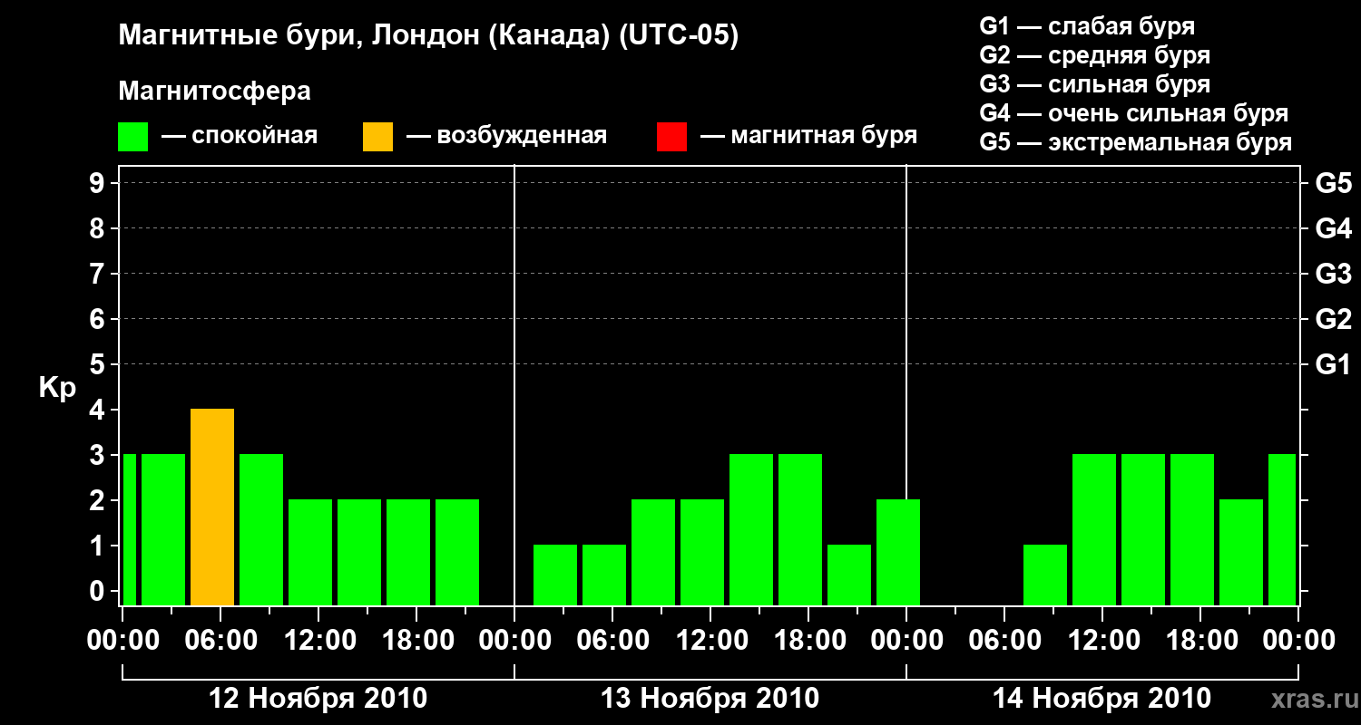 Изменения геомагнитного индекса Kp с 12 по 14 ноября 2010 года для средних широт