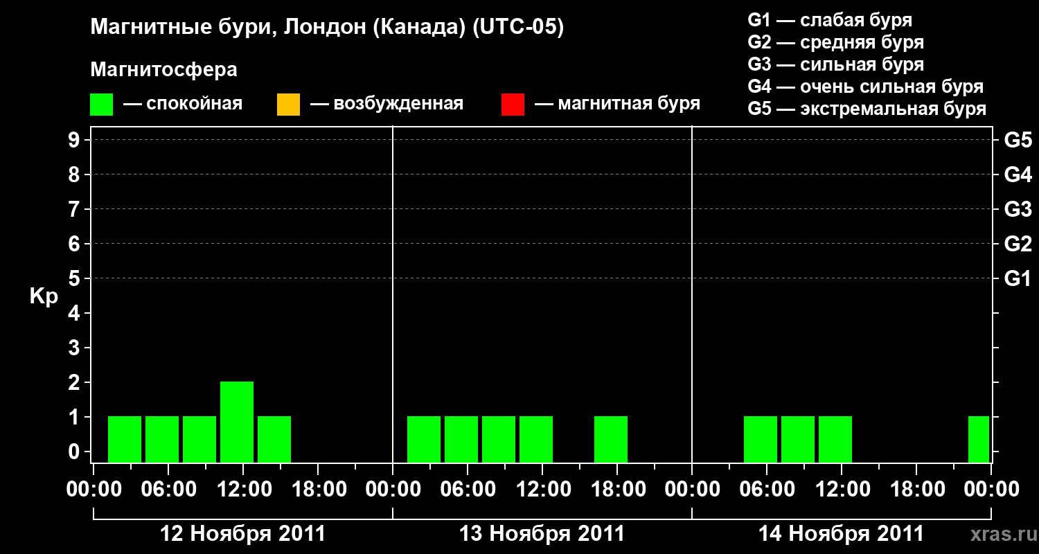 Изменения геомагнитного индекса Kp с 12 по 14 ноября 2011 года для средних широт