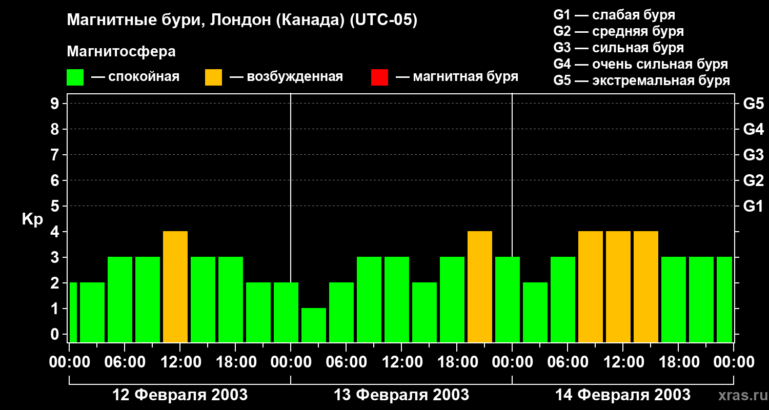 Изменения геомагнитного индекса Kp с 12 по 14 февраля 2003 года для средних широт