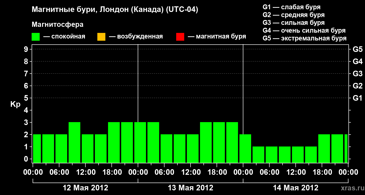 Изменения геомагнитного индекса Kp с 12 по 14 мая 2012 года для средних широт