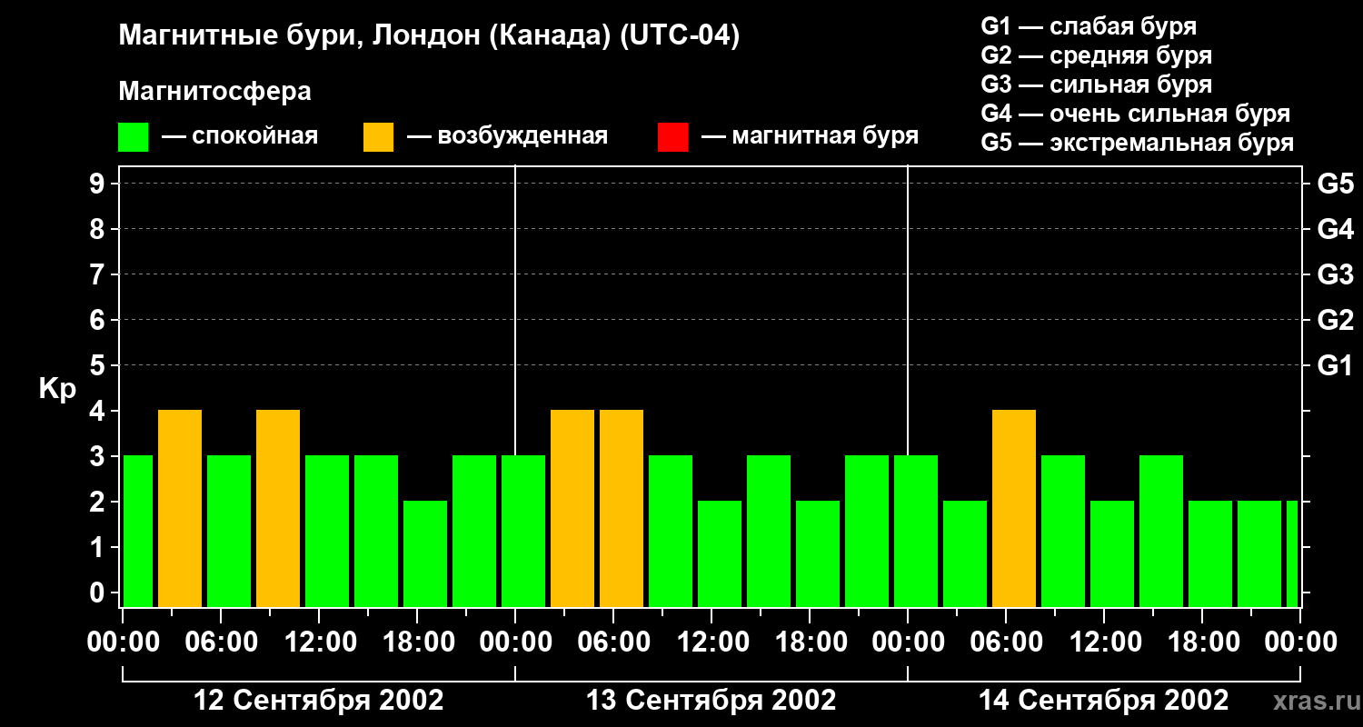 Изменения геомагнитного индекса Kp с 12 по 14 сентября 2002 года для средних широт