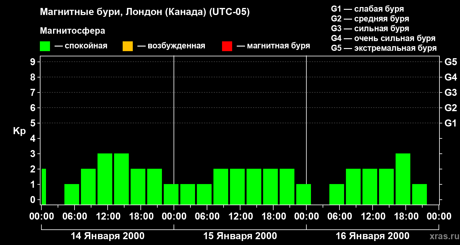 Изменения геомагнитного индекса Kp с 14 по 16 января 2000 года для средних широт
