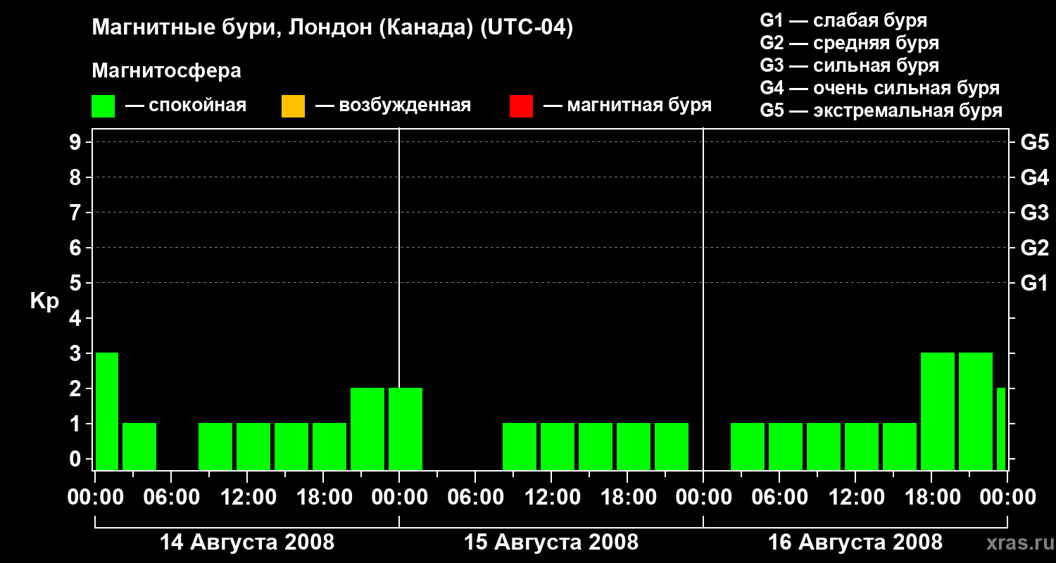 Изменения геомагнитного индекса Kp с 14 по 16 августа 2008 года для средних широт