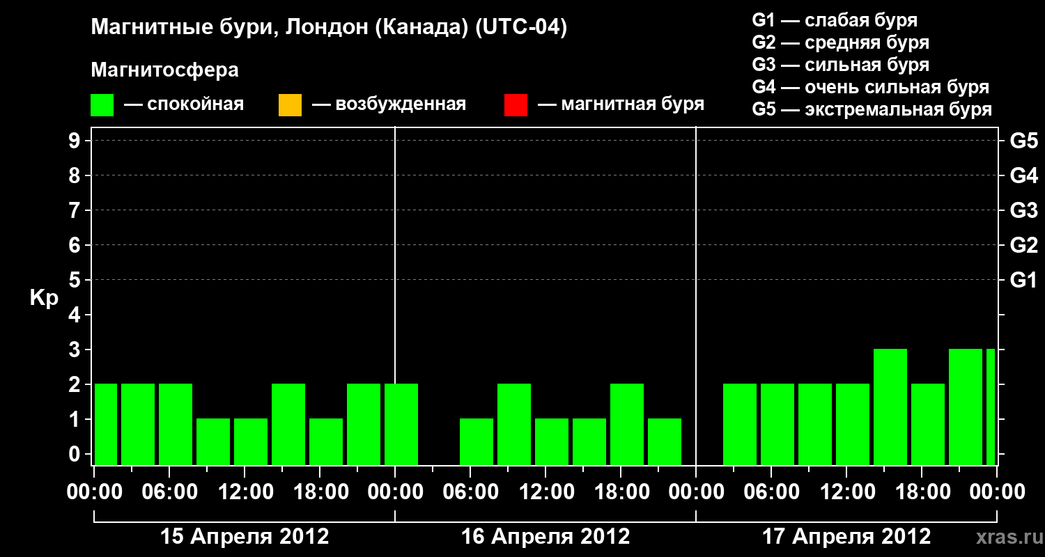 Изменения геомагнитного индекса Kp с 15 по 17 апреля 2012 года для средних широт