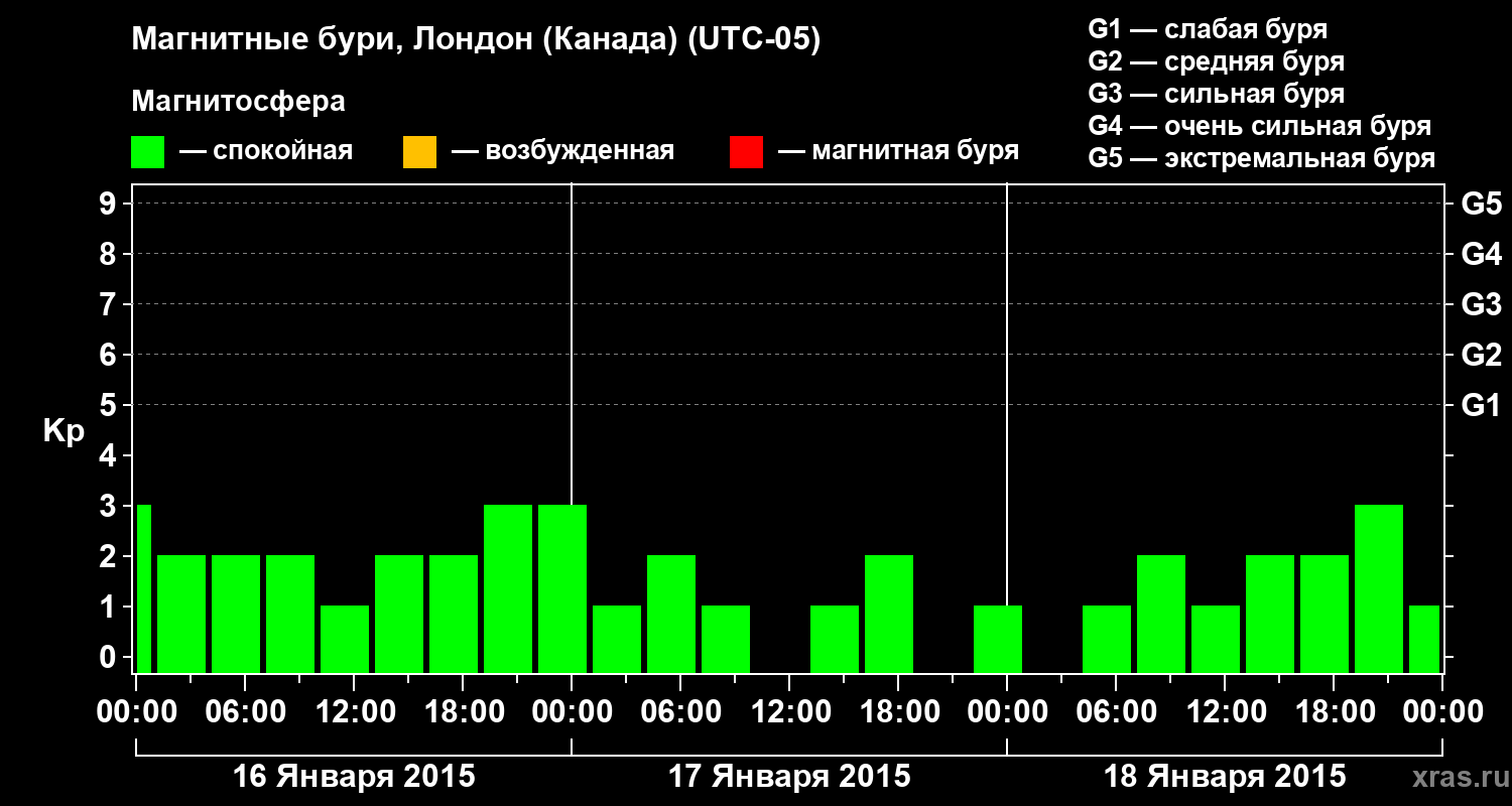 Изменения геомагнитного индекса Kp с 16 по 18 января 2015 года для средних широт