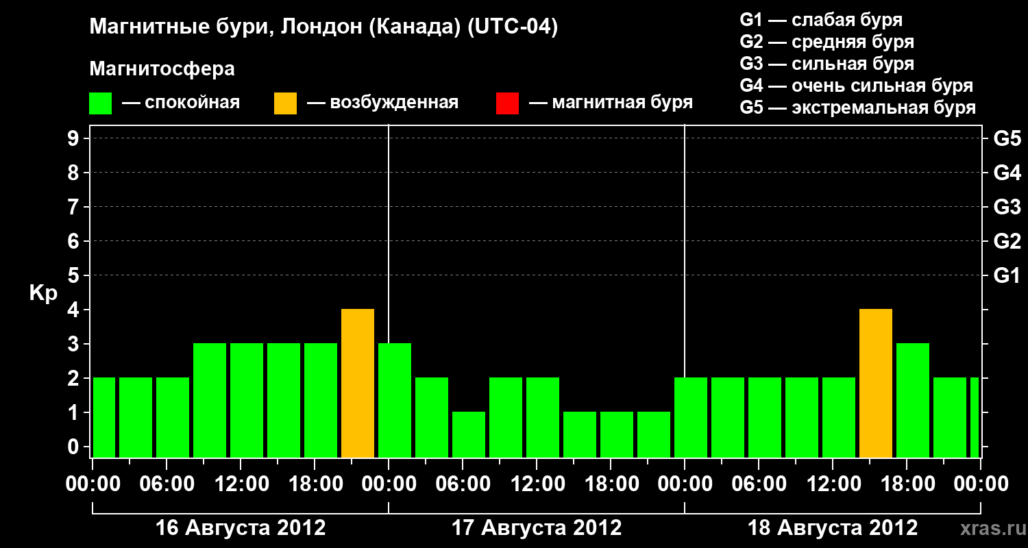 Изменения геомагнитного индекса Kp с 16 по 18 августа 2012 года для средних широт