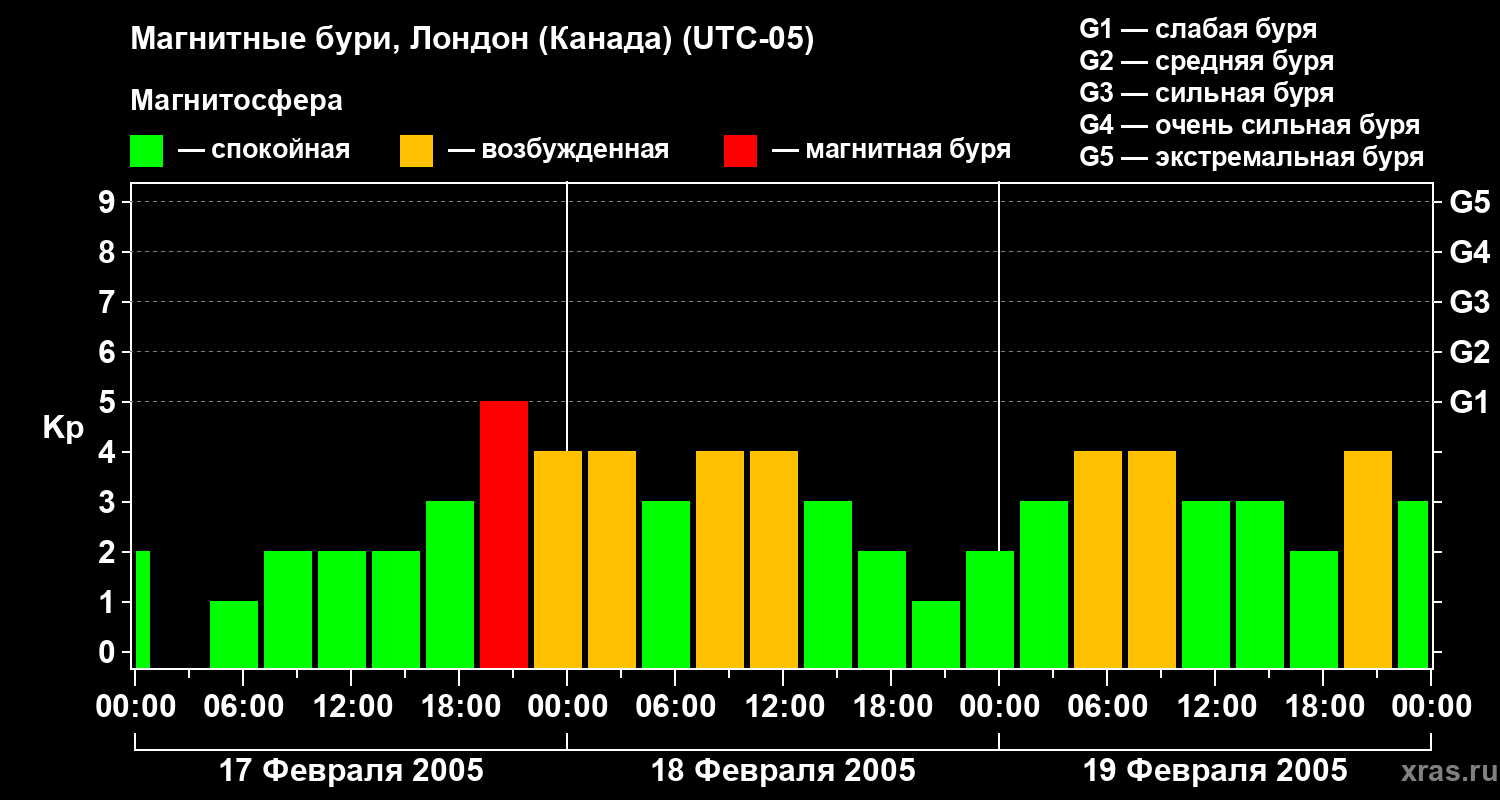 Изменения геомагнитного индекса Kp с 17 по 19 февраля 2005 года для средних широт