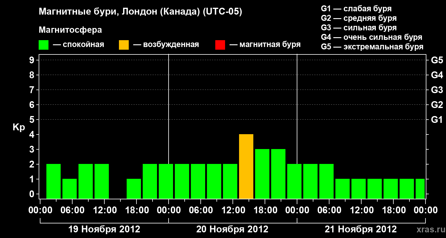 Изменения геомагнитного индекса Kp с 19 по 21 ноября 2012 года для средних широт