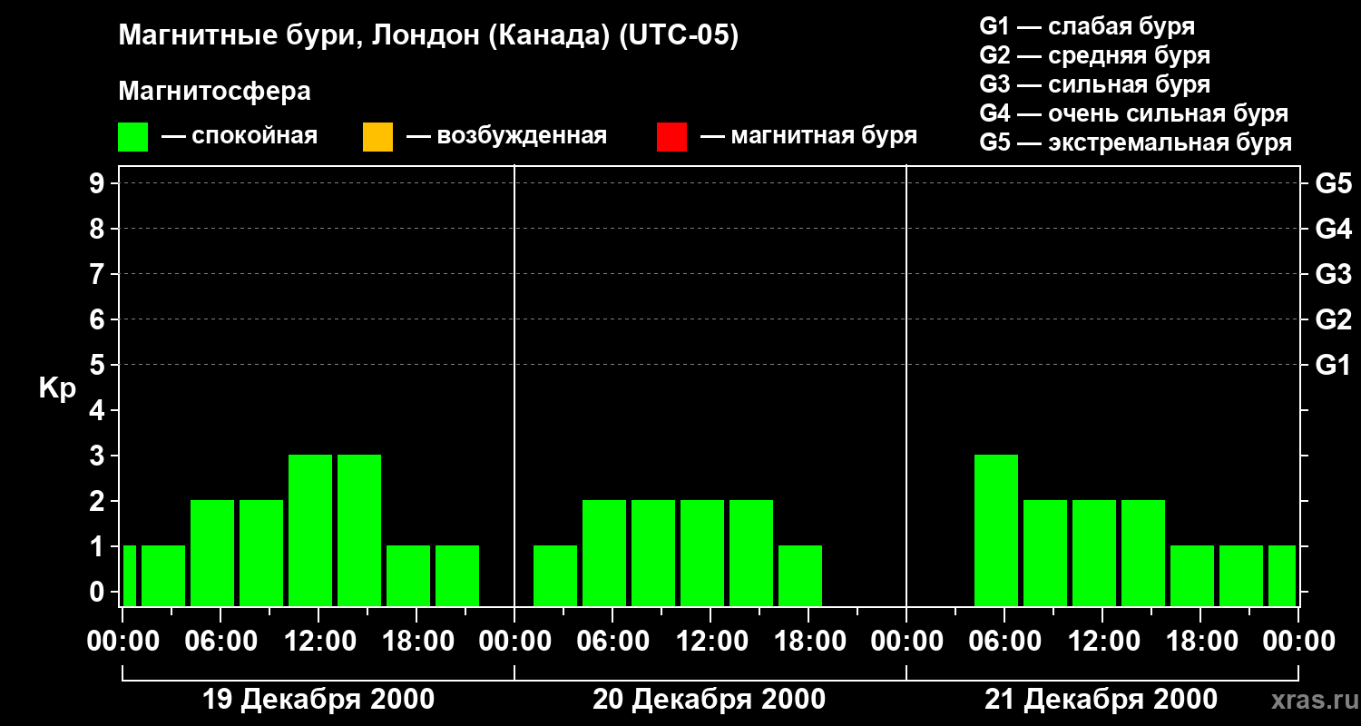 Изменения геомагнитного индекса Kp с 19 по 21 декабря 2000 года для средних широт