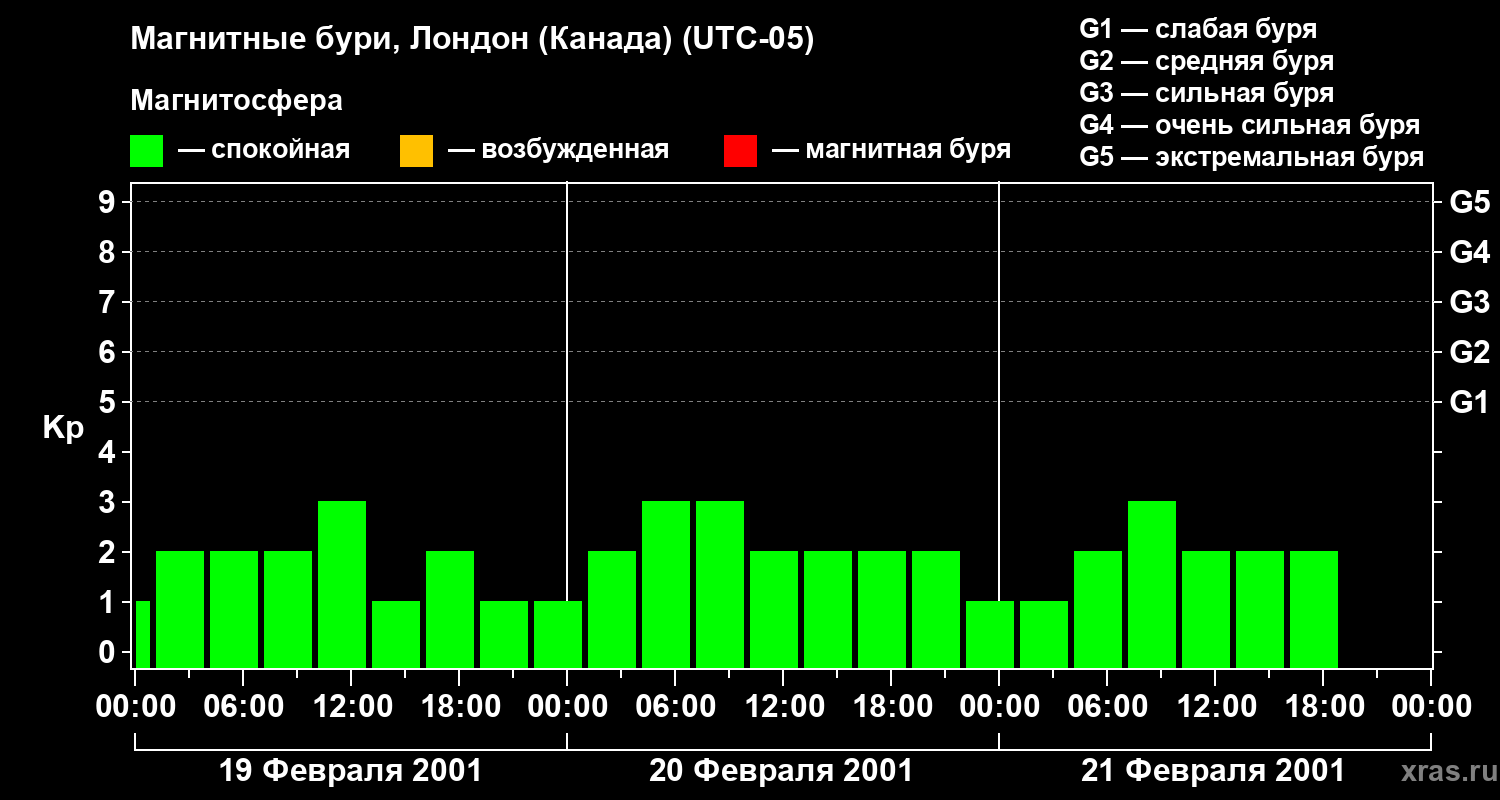 Изменения геомагнитного индекса Kp с 19 по 21 февраля 2001 года для средних широт