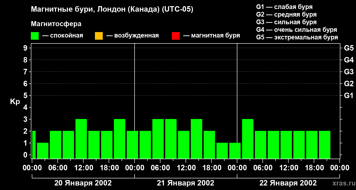 Изменения геомагнитного индекса Kp с 20 по 22 января 2002 года для средних широт