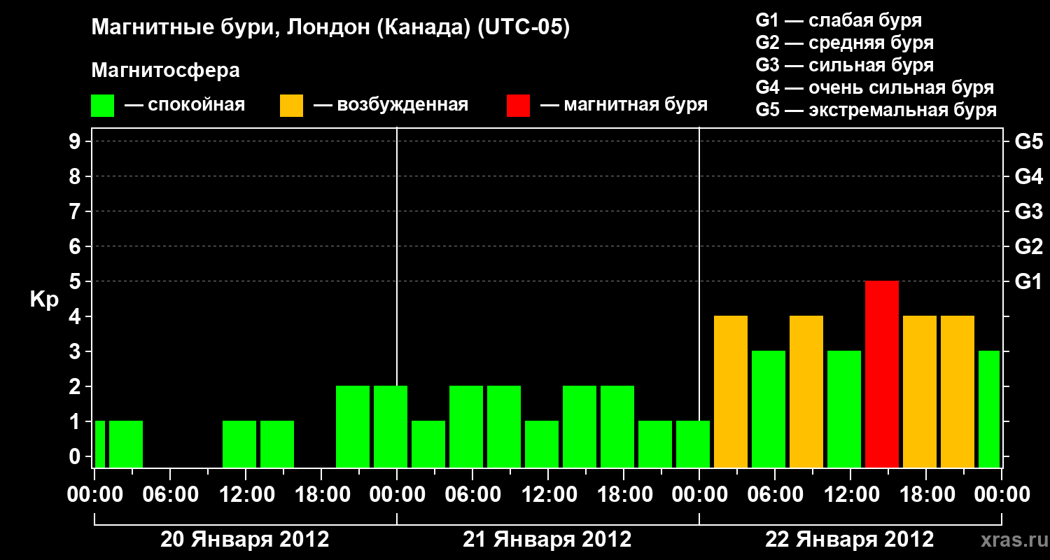 Изменения геомагнитного индекса Kp с 20 по 22 января 2012 года для средних широт