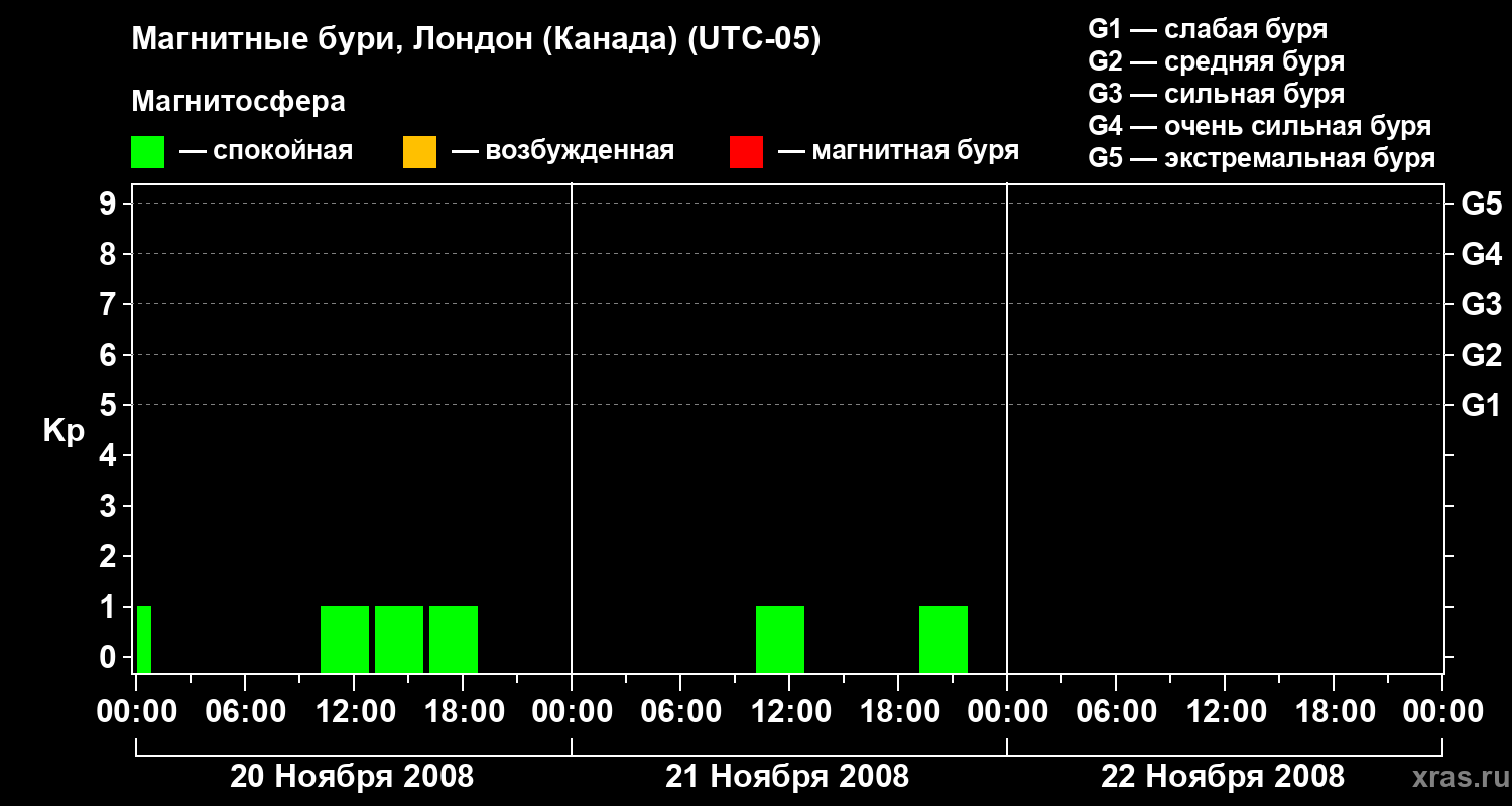 Изменения геомагнитного индекса Kp с 20 по 22 ноября 2008 года для средних широт