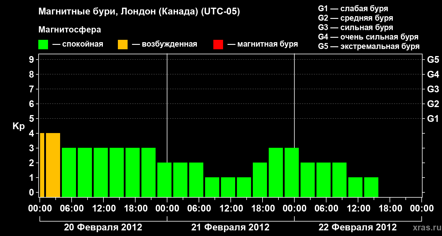 Изменения геомагнитного индекса Kp с 20 по 22 февраля 2012 года для средних широт