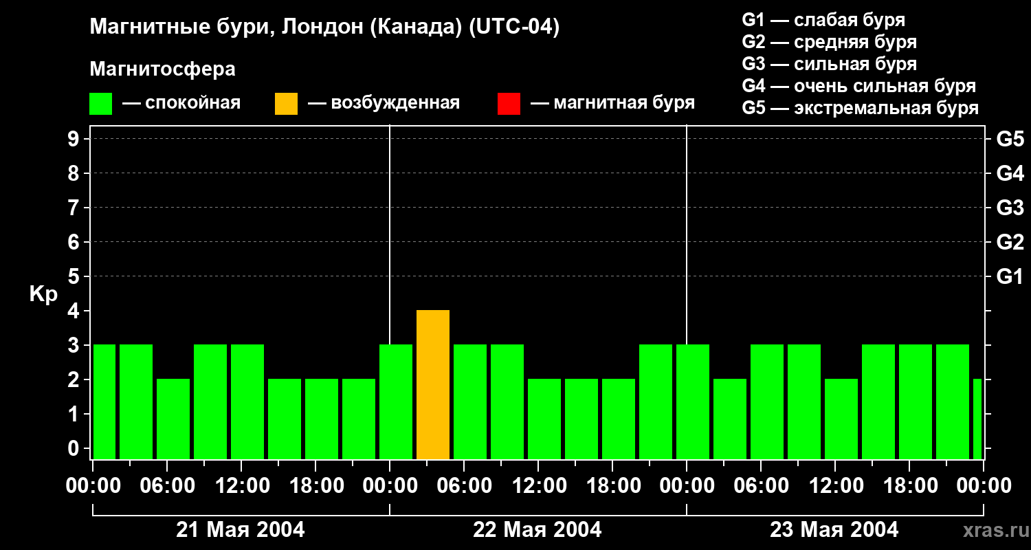 Изменения геомагнитного индекса Kp с 21 по 23 мая 2004 года для средних широт