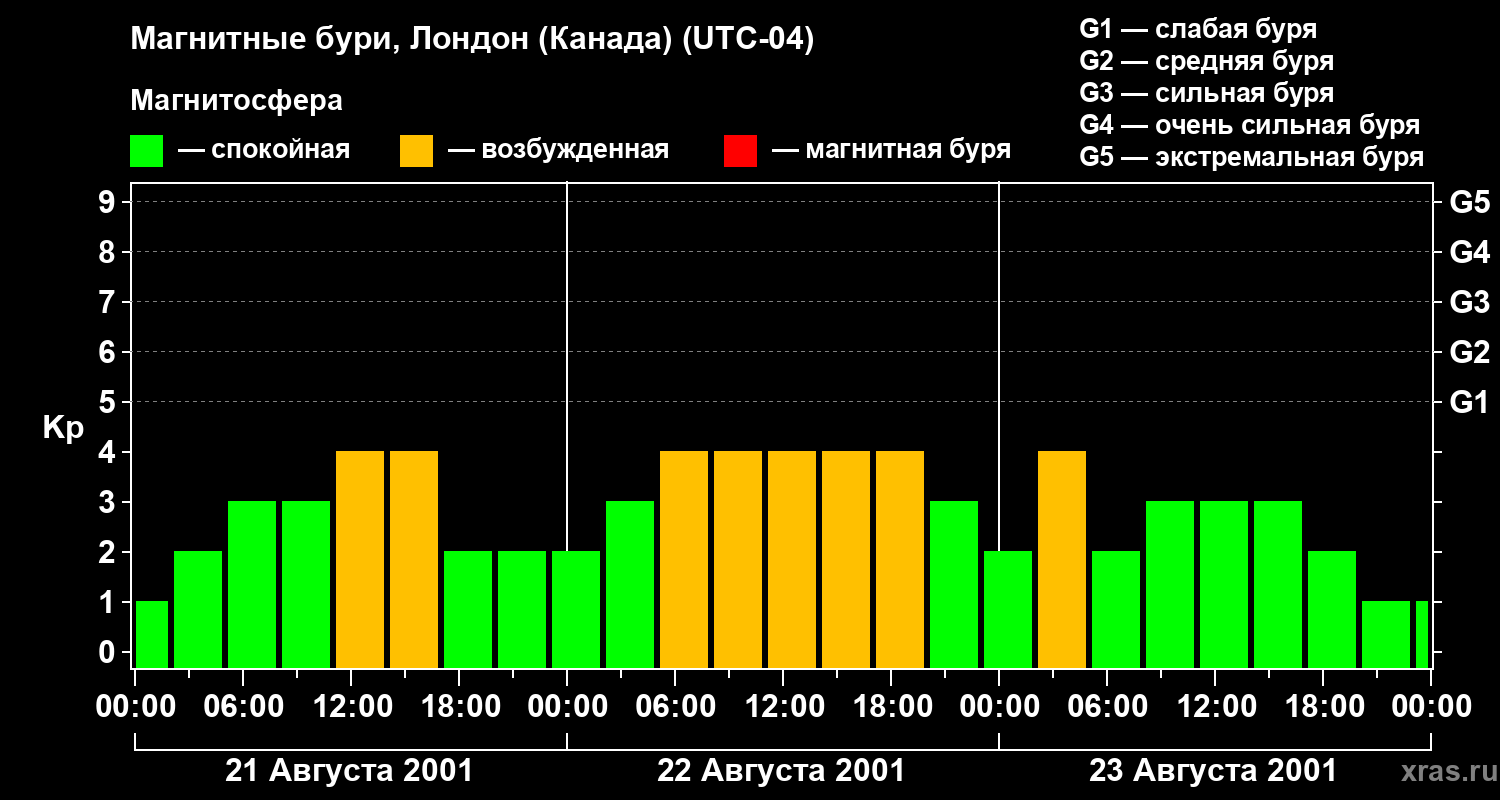 Изменения геомагнитного индекса Kp с 21 по 23 августа 2001 года для средних широт