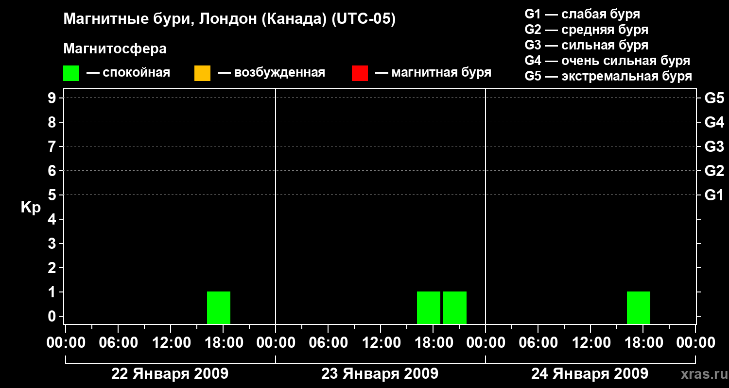 Изменения геомагнитного индекса Kp с 22 по 24 января 2009 года для средних широт