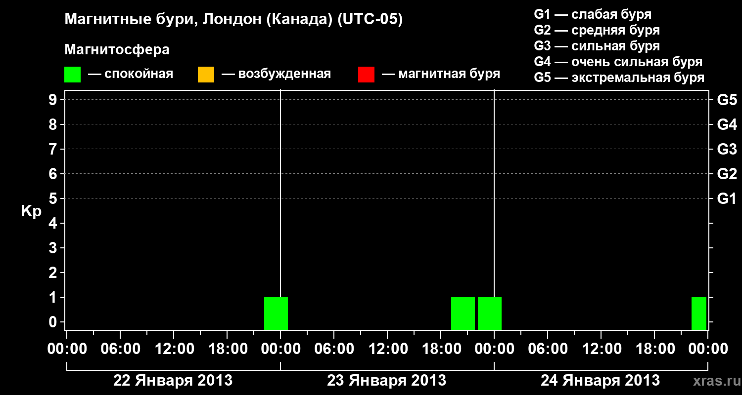 Изменения геомагнитного индекса Kp с 22 по 24 января 2013 года для средних широт