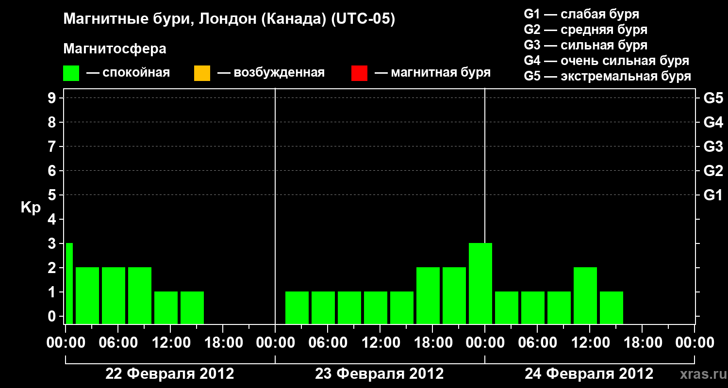 Изменения геомагнитного индекса Kp с 22 по 24 февраля 2012 года для средних широт