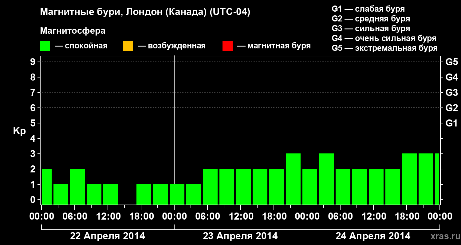 Изменения геомагнитного индекса Kp с 22 по 24 апреля 2014 года для средних широт