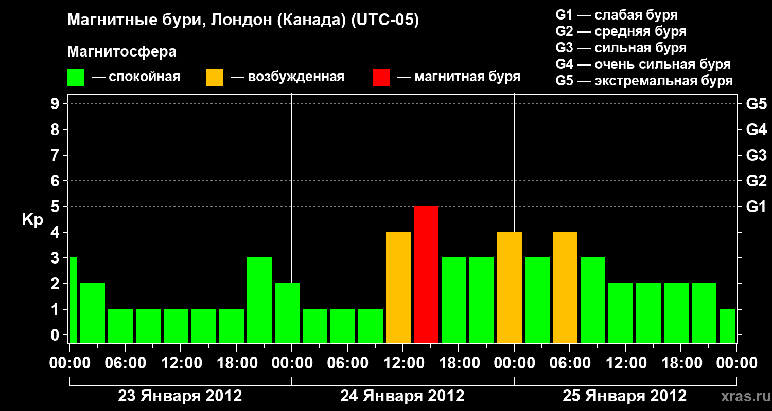 Изменения геомагнитного индекса Kp с 23 по 25 января 2012 года для средних широт