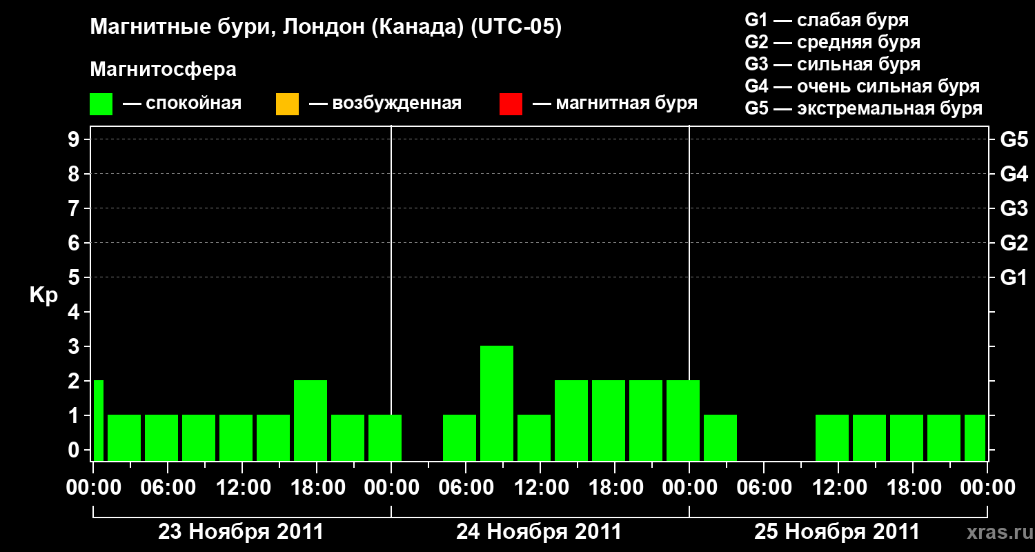 Изменения геомагнитного индекса Kp с 23 по 25 ноября 2011 года для средних широт