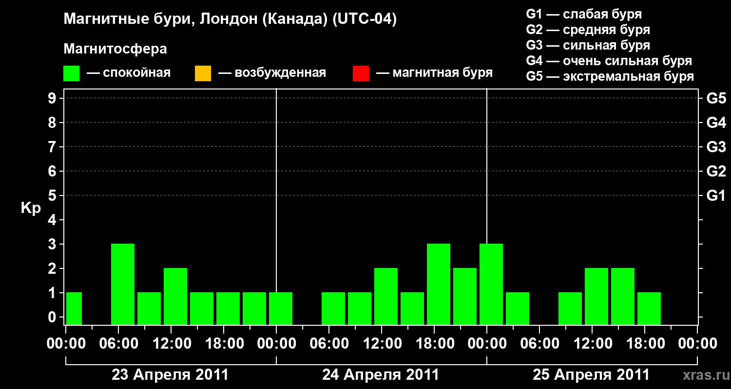 Изменения геомагнитного индекса Kp с 23 по 25 апреля 2011 года для средних широт