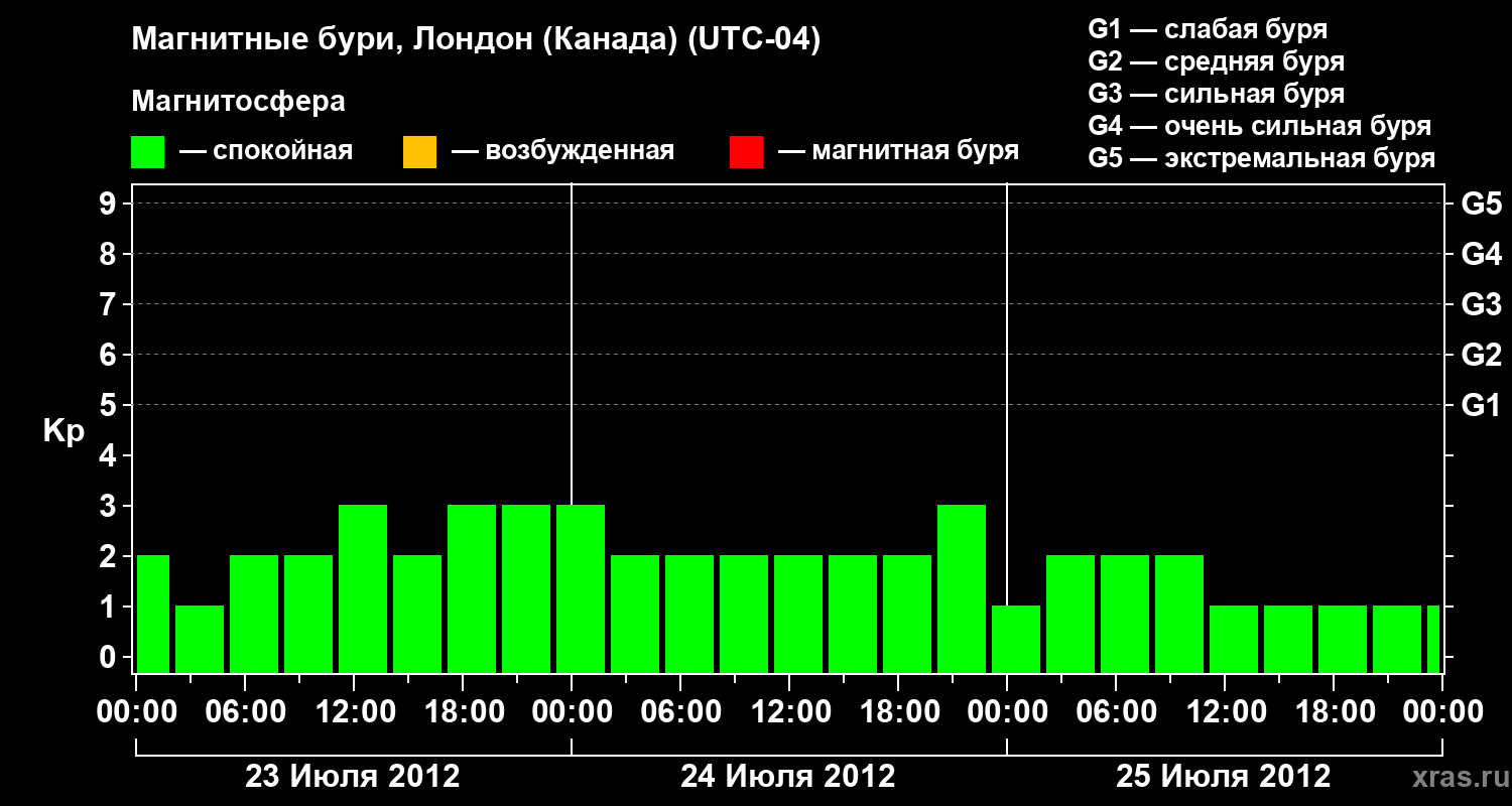 Изменения геомагнитного индекса Kp с 23 по 25 июля 2012 года для средних широт